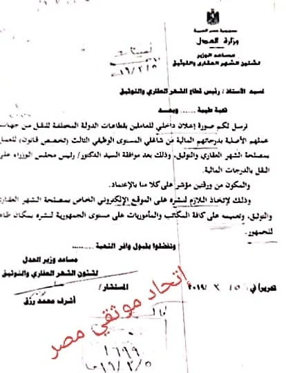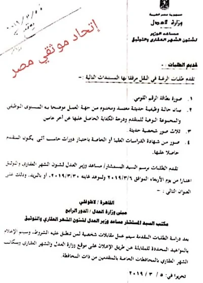 وزارة العدل " مصلحة الشهر العقارى والتوثيق " اعلان وظائف داخلى للعاملين بقطاعات الدولة عن طريق النقل من جهاتهم الاصلية بنفس الدرجة المالية من شاغلى المستوى الوظيفى الثالث تخصص قانون للعمل بمصلحة الشهر العقارى