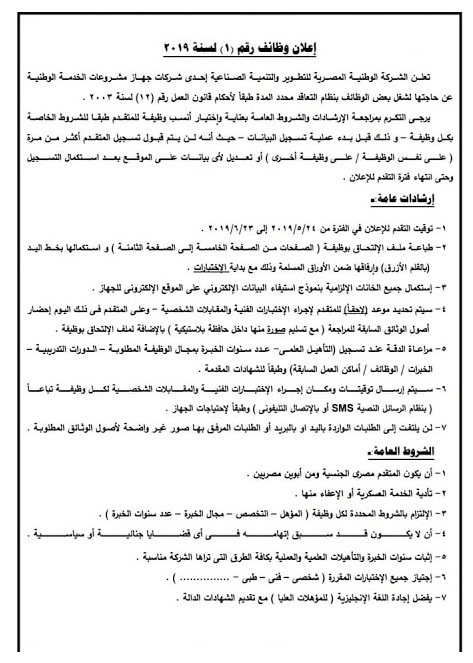 الشركة الوطنية المصرية للتطوير والتنمية الصناعية احدى الشركات التابعة لجهاز مشروعات الخدمة الوطنية حيث تعلن الشركة عن حاجتها الى شغل العديد من الوظائف الشاغرة بنظام التعاقد على ان يكون التقديم حتى 23 / 6 / 2019
