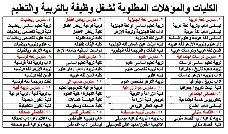 وفى سياق ذلك ستكون التخصصات التى بها عجز هى نفس التخصصات التى كان بها عجز فى المسابقة الماضية وربما تزيد بعض التخصصات فى بعض المحافظات وتسهيل على الجميع نقوم بنشر التخصصات والكليات والمؤهلات التى تناسبها فى حالة الاحتياج لها او اعلان الوزارة عجز فى ذلك التخصص سيكون الكليات والمؤهلات المطلوبة كما هى موضحة