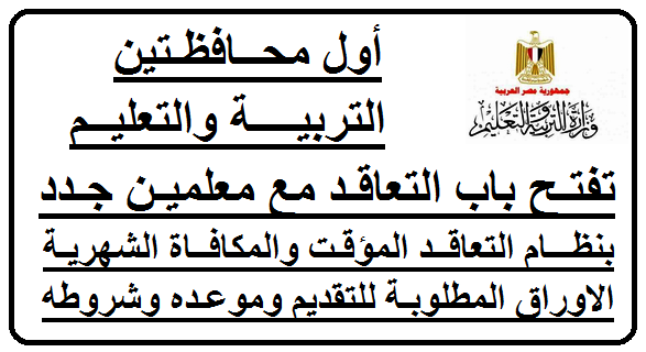 ننشر اليوم أول محافظتين على مستوى الجمهورية يتم فتح باب التعاقد المؤقت للمعلمين الجدد لسد العجز بالمدارس سواء بنظام التعاقد المؤقت او بنظام المكافاة الشهرية وهما محافظة بنى سويف ومحافظة اسيوط وسيتم متابع لباقى المحافظات خلال الساعات القادمة والاعلان عن اى تعاقدات جديدة اخرى بباقى المحافظات