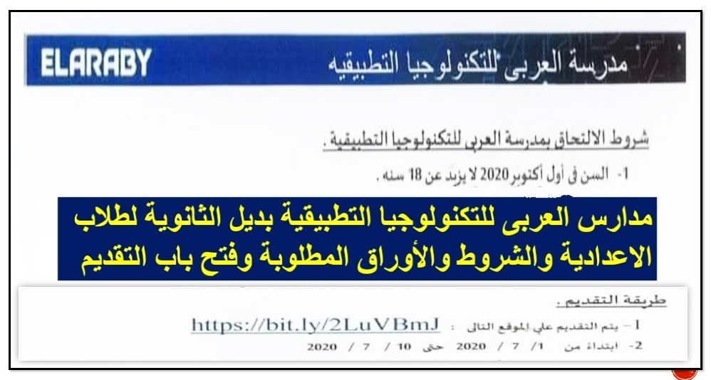 تعلن مدرسة العربى للتكنولوجيا التطبيقية عن فتح باب الالتحاق بالمدرسة من الطلاب الحاصلين على الشهادة الاعدادية 2019 / 2020 على ان يتم التقديم على الموقع الرسمى الكترونيا بدءا من يوم 1 / 7 / 2020 حتى 10 / 7 / 2020 وفقا للشروط والاوراق المطلوبة بالاعلان الرسمى التالى