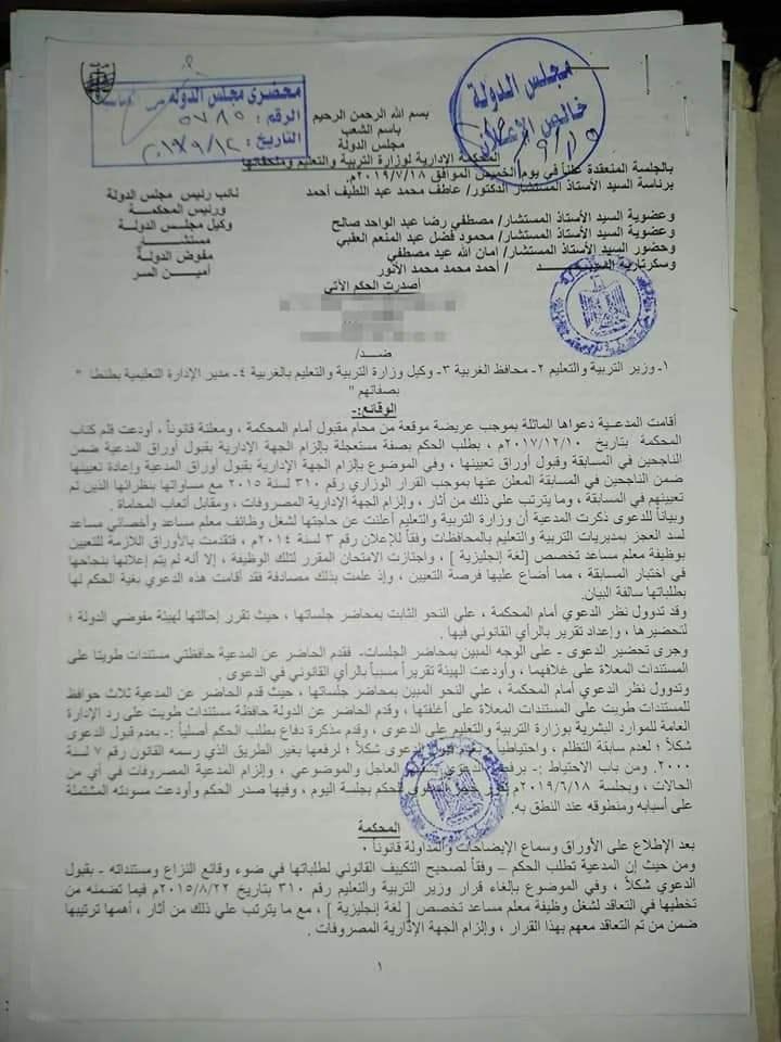 ملحوظه يوضح خبر عاجل ان هذا الحكم للمدعيه فقط وللحصول على حكم مماثل لابد ان يرفع المتقدم السابق دعوى قضائية وان يكون لديه مايثبت تخطيه فى التعاقد حينها وان يتقدم بصوره هذا الحكم للمحامى للتأكد من مدى حقه اذا قام برفع دعوى مماثلة لتلك الدعوى ونسبه النتيجة المتوقعه وفقا لحالته ويمكن التحقق من الدعوى من رقمها والمحامى باول ورقه مرفقه وهذا للتنويه اللازم حتى لايقع احد تحت اى جشع من اى طرف ويجب التأكد من كل ذلك من خلال قراءه الاوراق المرفقه والتاكد من المحامى الادارى من نجاح الدعوى من عدمها حسب حاله المدعى