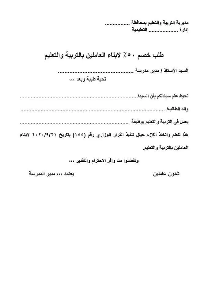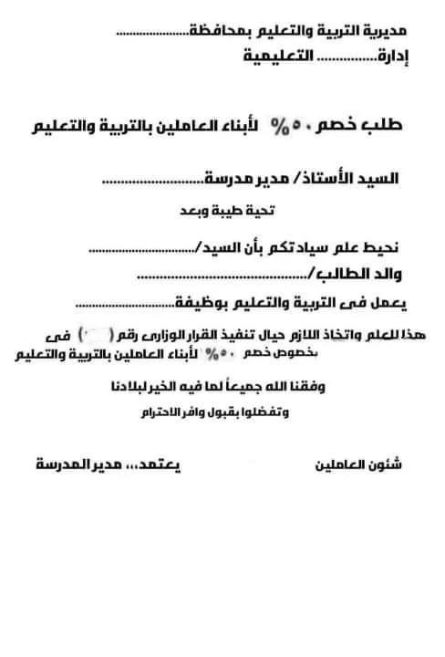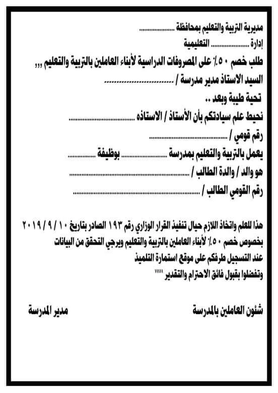 نموذج طلب خصم 50٪ لابناء العاملين بالتربية والتعليم للطباعه