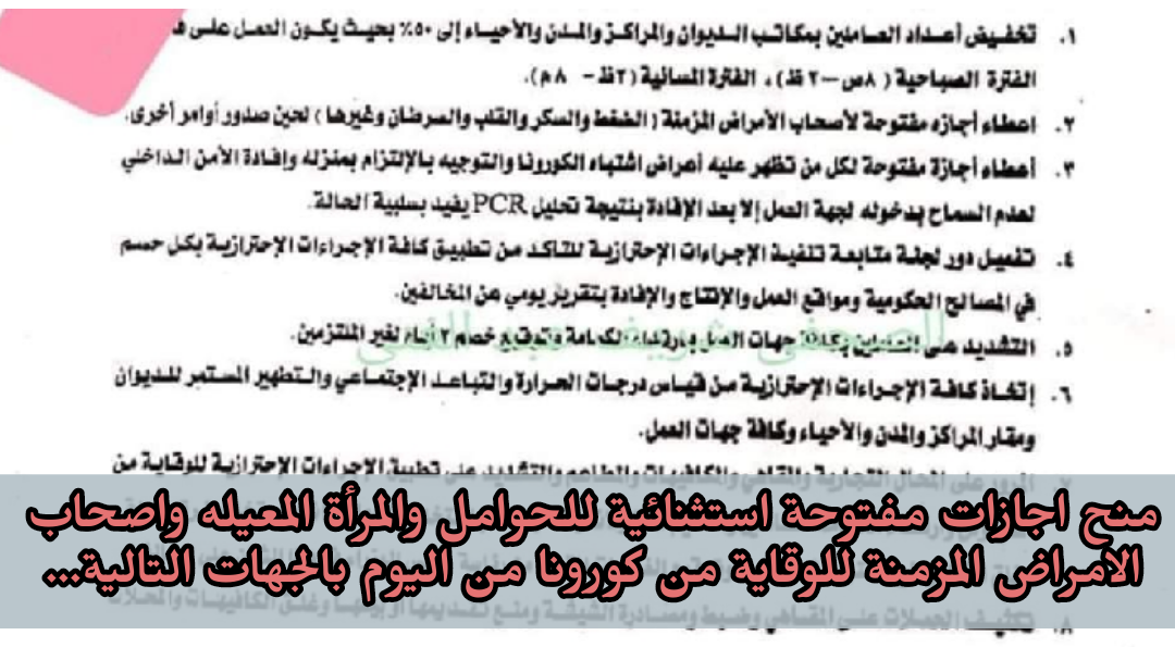 منح اجازات مفتوحة استثنائية للحوامل والمرأة المعيله واصحاب الامراض المزمنة للوقاية من كورونا من اليوم بالجهات التالية...