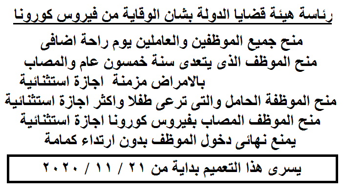 نظراً للظروف التى تمر بها البلاد وحرصا من رئاسة هيئة قضايا الدولة على اتخاذ كافة التدابير الاحترازية للوقاية من فيروس كورونا المستجد
