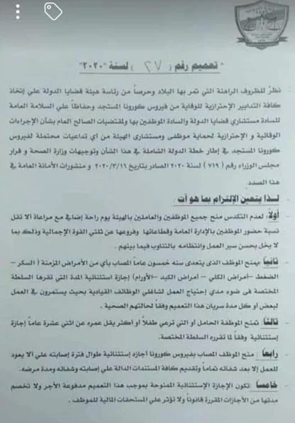 منح الموظف المصاب بفيروس كورونا اجازة استثنائية طوال فترة اصابتة والا يعود للعمل الا بعد شفائة تماما