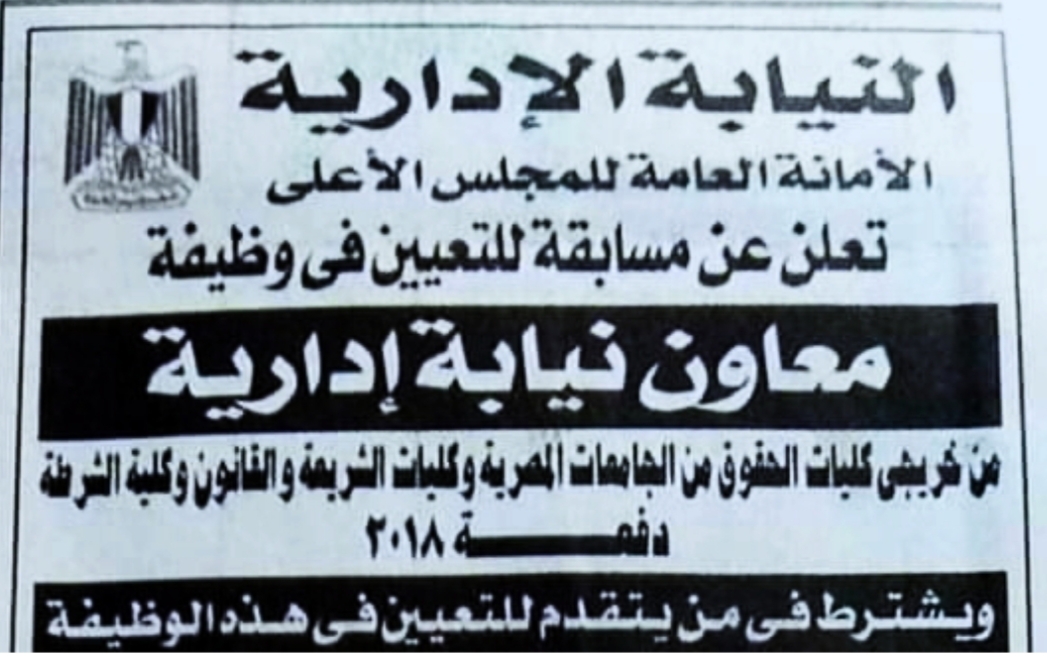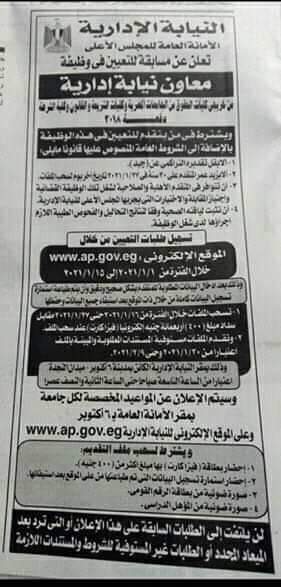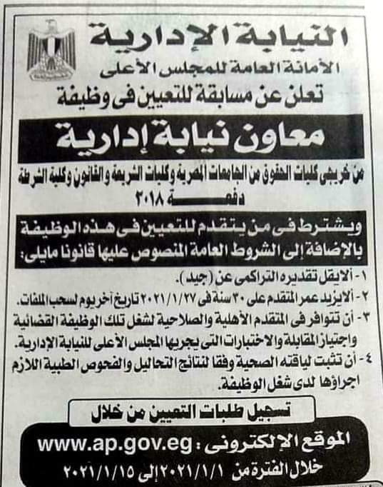 اعلنت النيابة الإدارية عن مسابقة للتعيين في وظيفة معاون نيابة إدارية من خريجي كليات الحقوق والشريعة والقانون والشرطة دفعة ٢٠١٨ بتقدير عام جيد. على ان تسجل الطلبات من خلال الموقع الإلكتروني في الفترة من ١ يناير ٢٠٢١ الي ١٥ يناير ٢٠٢١